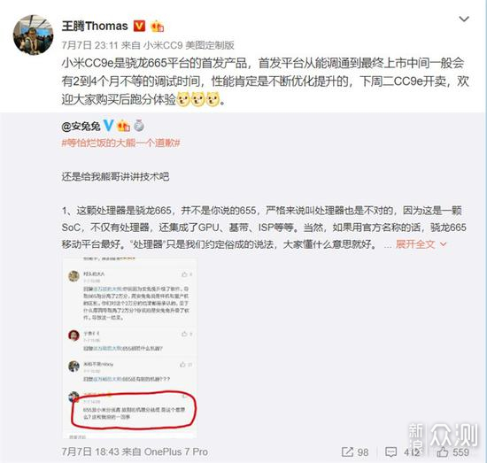 3、 安兔兔官微与某博主互怼,小米王腾回应 此前,有数码博主@万能的大熊 发文暗示小米9CCe的骁龙665跑分存“作弊嫌疑”,质疑安兔兔收钱改分,随后安兔兔官方微博小编与其辩论,双方已互相回应数日。7月7日日晚间,小米官方注意到了安兔兔与该数码博主的“互怼”事件。小米公司产品总监王腾针对此事回应称,小米CC9e是骁龙665平台的首发产品,首发平台从能调通到最终上市中间一般会有2到4个月不等的调试时间,性能肯定是不断优化提升的。据悉,骁龙665是骁龙660的升级版,采用三星11nm LPP工艺制造,核心采用4xKryo 260(A73)+4xKryo 260(A53)构造,频率分别为2.0GHz和1.8GHz。GPU为Adreno 610,支持Vulkan 1.1。另外,骁龙665还搭载Heagon 686 DSP和Spectra 165 ISP,这颗ISP最高支持4800万像素单摄像头,还支持三摄。其他部分并没有太多变化。