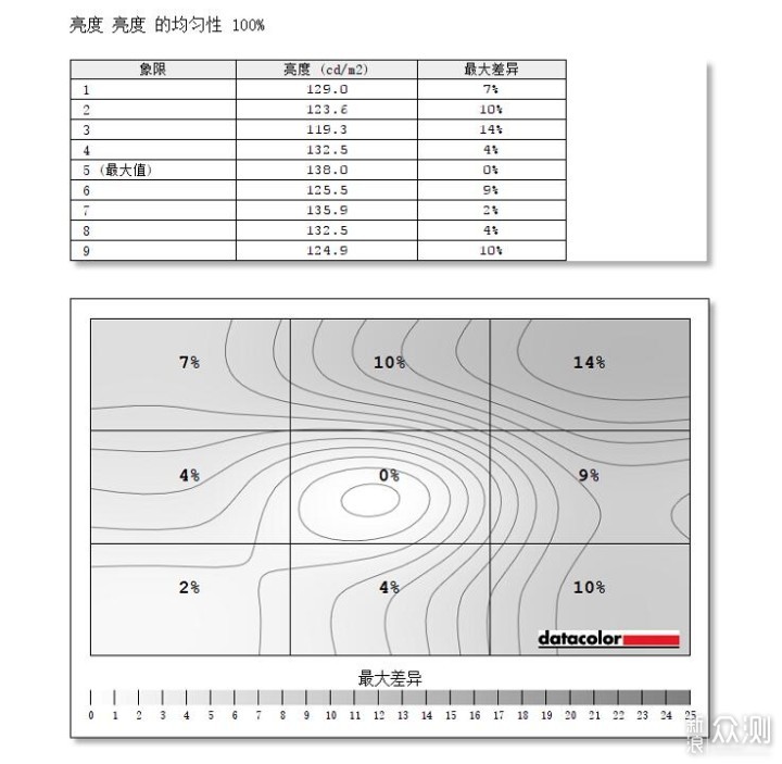 ​亮度均匀测试中,用灰色的深浅程度表示屏幕的亮度,灰色越深则亮度越低,白色则表示亮度最高。测试结果显示,ZOWIE GEAR XL2540的屏幕的整体亮度均匀性比较不错,5号区域也就是接近屏幕中间的位置亮度最高。​