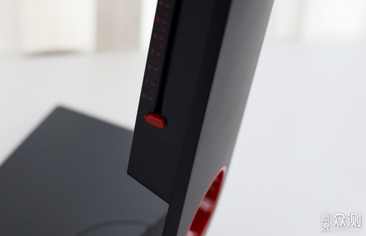 ​在显示器支架与底座连接的地方有红点角度标识,侧面有红点高度标识,顶部有仰角角度标识。​