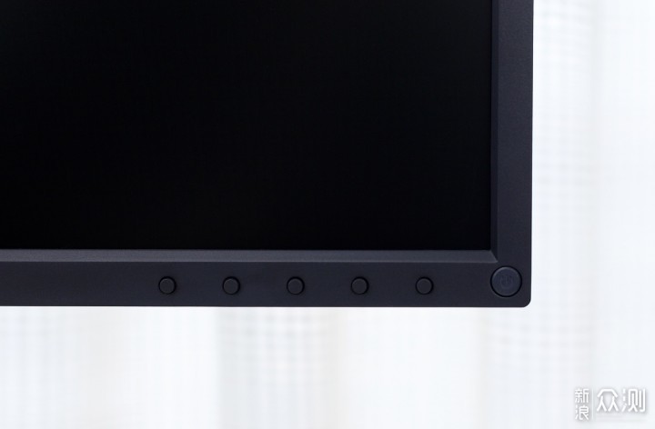 ​在显示器正面的右下角是电源开关和OSD菜单控制按键,均为实体按键,可以调控显示模式、色彩亮度、色彩饱和度、暗部场景模式、系统设置等。​