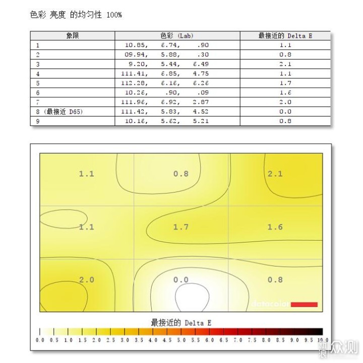 ​色度均匀测试中,数值越大、黄色越深表示差值越大,越不均匀;数值越小越接近D65,表示色度均匀性越好。测试结果显示,8号区域也就是屏幕的底部中间区域的色度均匀性最好。​