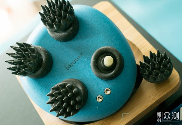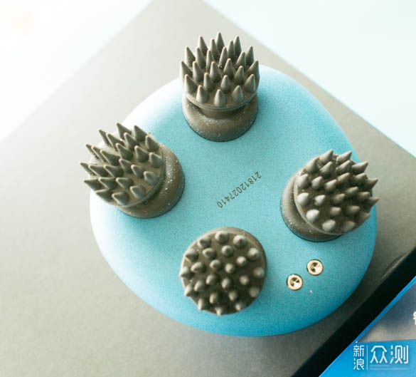 我们再来看看按摩器的底面,底面是蓝色,可以看见有四个按摩爪,每个按摩爪有24个触电,按摩爪是硅胶的。同时,可以看见底部有2个金属凹点。
