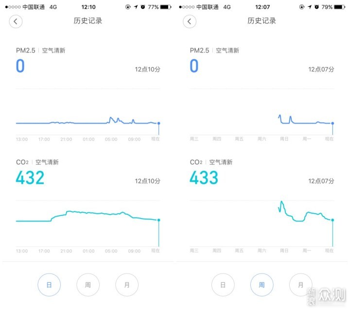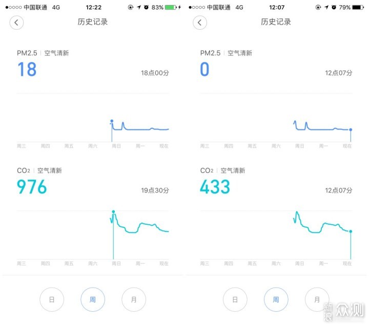 3、历史空气质量记录,分为日、周、月三个记录,目前用了几天可以从记录上看出PM2.5和二氧化碳浓度明显的下降。