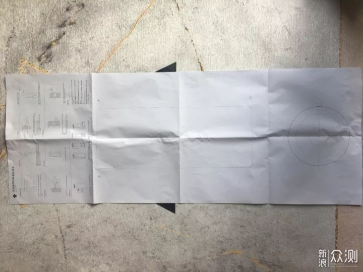 箱子中有一个配件很好,就是用于确定设备悬挂位置及打孔位置的纸,上半部分是安装说明,下边会有使用照片。