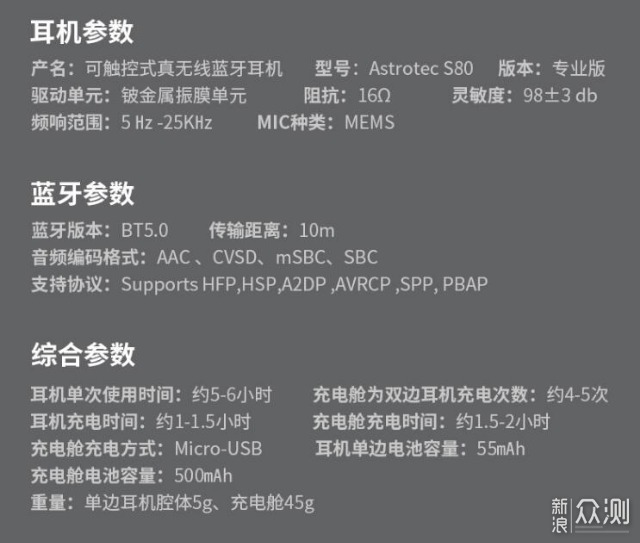前面提到S80是可以单独使用的,如果同时拿出两只耳机或者先取出右边的,配对后的默认名称是会显示Astrotec-S80-R,单独使用左边的配对名是Astrotec-S80-L,不同的名字方便区分,这个细节做得要比漫步者TWS5好。S80支持AAC和SBC两种蓝牙解码,但是我分别在OPPO R17 Pro、魅族16s、荣耀Note10上测试,前面二款都是SBC模式,只有荣耀Note10才能用AAC。安卓手机对于AAC的支持并不完善,S80不支持aptX是最大的不足。 三、同类产品对比