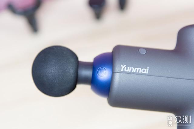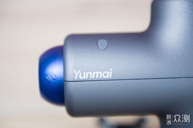 枪头部位有云麦的品牌标识,顶部有指示灯可以显示筋膜枪的实时档位,按摩头相对为手机的开关,长按为开机状体可以进行筋膜枪的操作,第二次按会提升档位,在休息期间筋膜枪会处于待机状态能够快速启动。