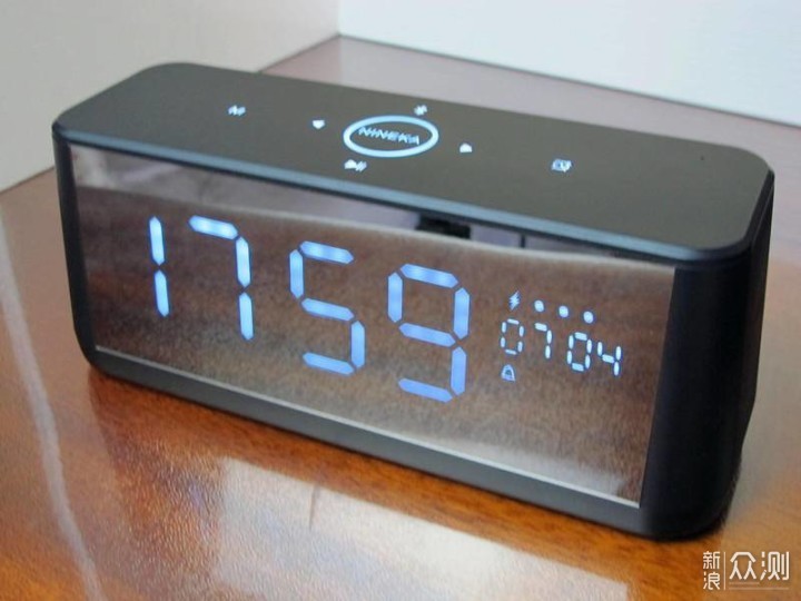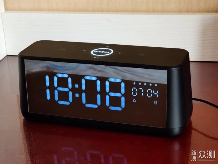 NINEKA南卡B1蓝牙音箱的正面是一块屏占比极高的镜面显示屏,尤其是LED时钟的字体十分硕大,即使是远距离也能看清楚时间,而且白色的LED显示效果也不错。