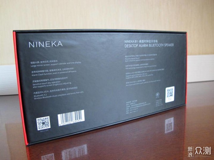NINEKA南卡B1的包装盒体积比较大,主色调为黑色,给人一种神秘的科技感。正面印有白色的音箱轮廓图案,左下角是红色的中英文字体,标明产品型号和名称,全称为“NINEKA南卡B1桌面时钟蓝牙音箱”,而右下角则是这款产品的几个突出特点。
