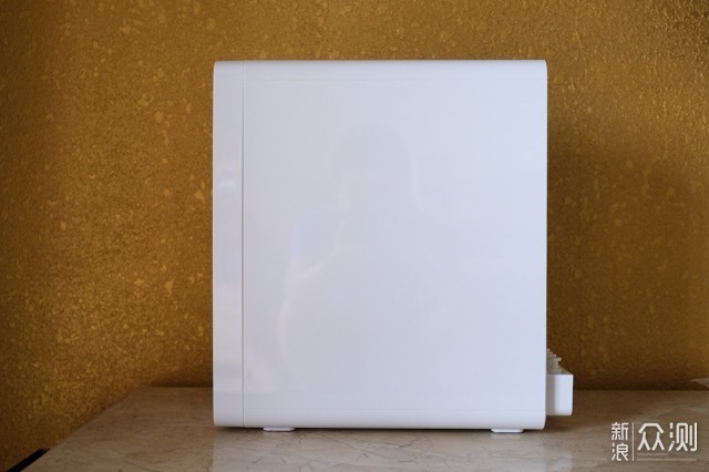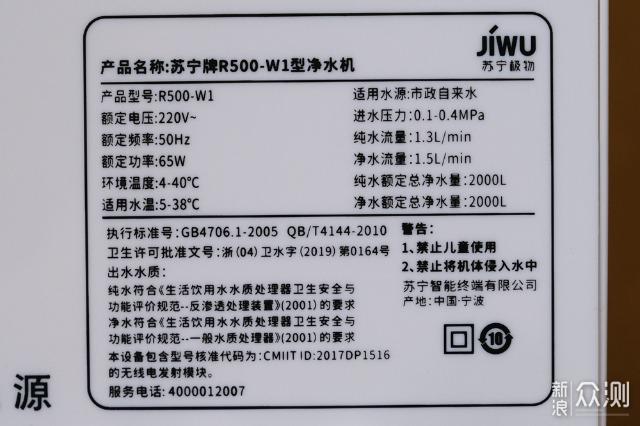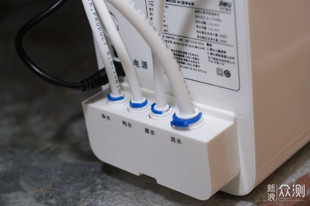 电源插孔位于机身背面,进水、废水、纯水、净水四个接口一字排开,因为每个接口旁边都有文字标识,所以要自己动手安装也不会接错的。此外,在机身背面还印有净水机的规格资料和相应App二维码。
