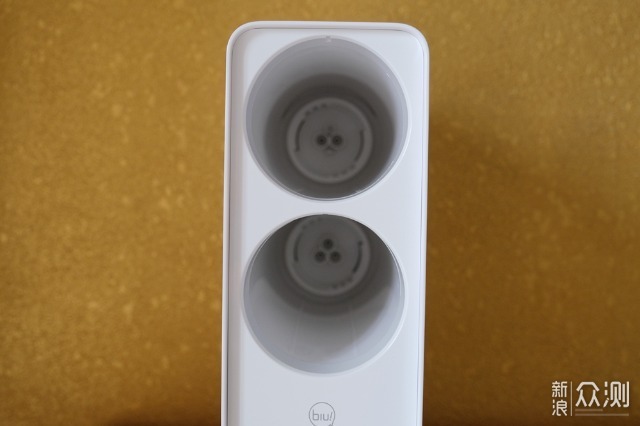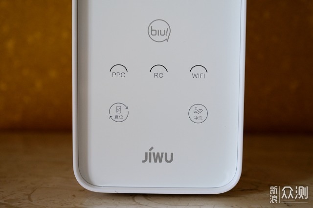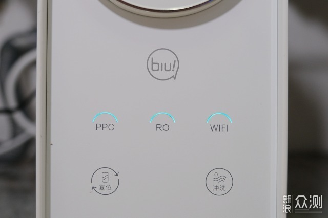 小Biu净水机的构造其实并不复杂,正面上方两个大圆孔用于安装滤芯,正面下方是操控区域,其实也就是两个按键三个指示灯而已。