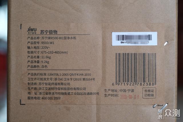 小Biu净水机是苏宁刚推出不久的新品,说起苏宁极物,其定位类似于网易严选、京造,小米有品的产品,旨在为消费者打造性价比高的产品。它采用一个大大的牛皮纸箱包装,在包装箱的侧面贴有产品的相关信息标签,包括了序列号。