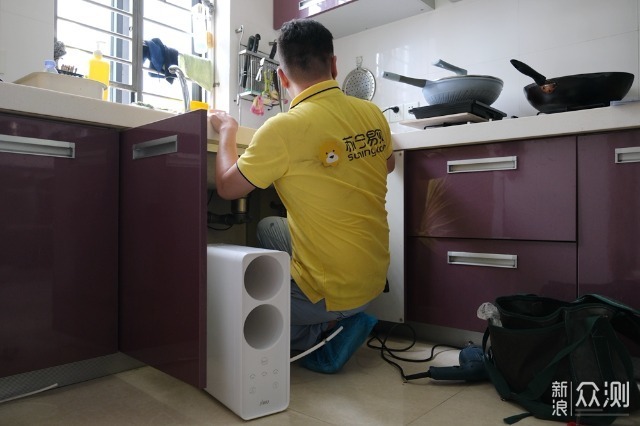 虽然小Biu净水机要自己动手安装也很简单,但是我还是等师傅上门安装,毕竟这个服务是免费的,师傅安装肯定会更加专业、到位。必须为苏宁易购的安装服务点个赞,师傅一进门就自己套上鞋套,怕弄脏我家地板。我家原来水槽安装水龙头的孔偏小,小Biu净水机配备的是双把双开单孔水龙头,结果一开安装不了,多亏师傅动手把孔钻大才顺利安装。