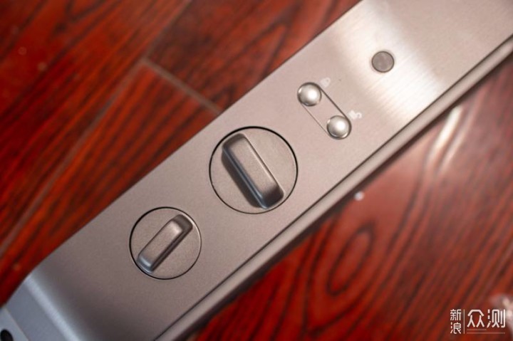 下图是后面板,用于安装在门内侧的。用的比较多的是两个小圆点,分别是开锁和反锁。下图里两个一大一小的旋钮分别是物理开锁和物理反锁,平时用得不多,只有门锁没电的时候才会用到。