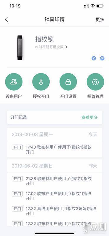 德施曼Q5智能锁需要使用小嘀管家和德施曼Q5智能锁的蓝牙/WiFi进行各种设置。打开小嘀管家的首页可以看到下面这个页面,大家会发现其实App会记录每一次开门的时间点,由于我已经录入了我自己和老妈的指纹,所以可以看见谁在什么时间点进过家门一目了然!