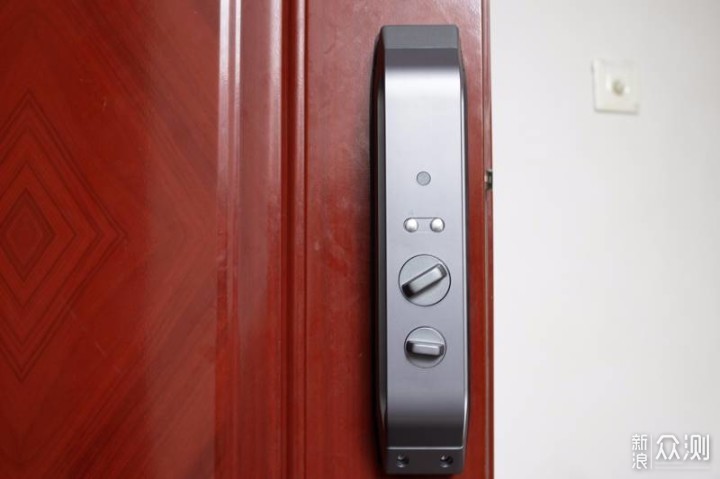 下图是后面板,也就是安装在屋内一侧门面的,平时我使用最频繁的是电动开锁和电动反锁键,一按即成挺方便,下面两个旋钮是物理开锁和物理反锁,有点紧,我不太喜欢用。