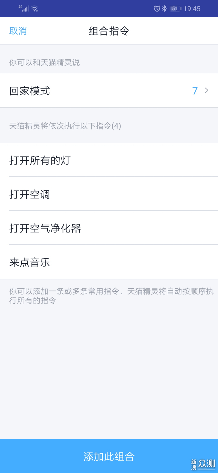 3.组合指令 如果你是一个经验丰富的数码科技产品用户,可以另外购置天猫精灵的周边配件,设置组合指令,让房间里的智能家居电器之间产生有趣的联动,比方下图的,你可以对方糖R说“我回家了”,房间里的灯光、空调、空气净化器、音乐就会同时打开。