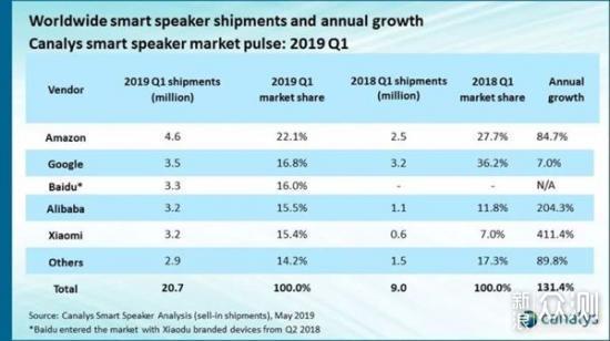 时至今日,已很少有人怀疑,从2014年亚马逊推出Echo算起,智能音箱已逐渐成为“后手机时代”第一个真正被大众接受的智能硬件产品,也是最近两年消费电子市场难得的爆品。 调查机构Strategy Analytics统计显示,2018年全球一共卖出8620万台智能音箱,今年这一数字或将攀升至1.4亿台。而具体到更波澜壮阔的中国市场,Canalys的报告显示:今年第一季度中国市场智能音箱出货量全球占比51%,首次超过美国,成为全球最大智能音箱市场。