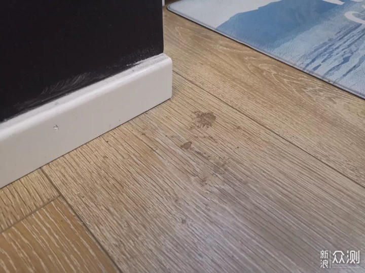 这部分主要就是测试比较顽固的污垢,可以看见上图是一个时间比较久的污渍了,具体多久我也不清楚,反正我扫拖机器人天天工作,喷水拖把一周用一次都没有去除。这次用擦地机走过一遍后就清理干净了(如下图)。