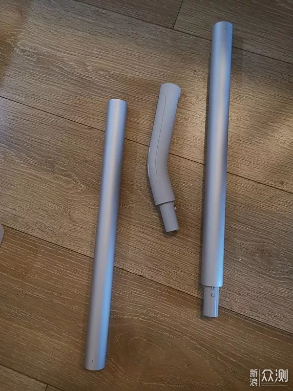 开箱后可以发现擦地机共7个配件,其中一个主机、一个充电桩、一根电源线、两种擦布、说明书和量杯各一,手柄三段。 2、手柄: