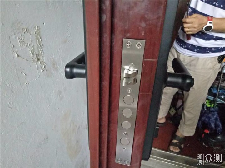 然后将内外两个面板连接起来就完成了整个青松沃德L12的安装。在面板的安装过程中遇到了以下问题,如果自行安装的亲们要注意了。 1、父母家防盗门内侧上方的螺杆和电源线的孔太小,导致内部面板的电源线无法穿过孔洞,还好父母家有工具可以开孔,否则就安装不上了。 2、在选择方柱的时候选择最长的,导致最后在外部面板无法贴合门上,请一定要选择适合自家门的方柱!