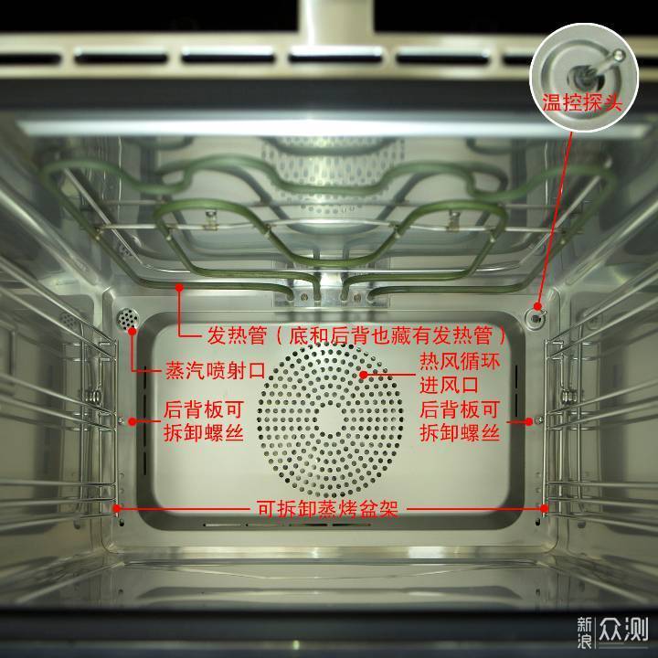 蒸烤箱内,顶部、后背、底部都有发热管,只是后背和底部有不锈钢板保护。左上角有一个蒸汽喷射口,右上角有一个温控探头,后背中间是热风循环进气口。左右两侧的烤盆架向外一拉就可以拆卸下来清洗,后背板拧开左右两个螺丝也可以拆卸清洗。