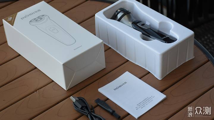 包装盒内部的陈列比较简单,也符合一般零售产品的陈列方式,剃须刀放置在塑料包装模具中,下方的凹槽内附赠有使用指南、清洁毛刷和Tpye C数据线。随机附件并不算特别丰富,但也基本能够满足日常使用。