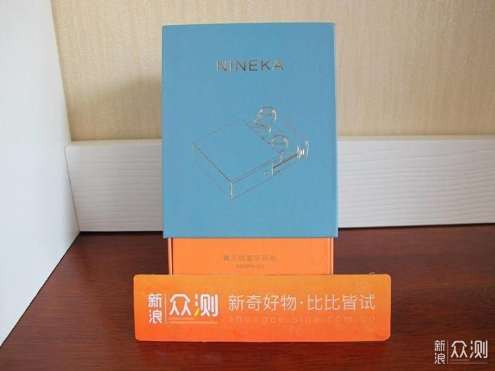Nineka N2蓝牙耳机的包装盒一如既往的采用了比较暗色调的色彩,而且是抽拉式结构,上半部分为蓝灰色的底色+下半部分橙色组合,表面都用烫金工艺的耳机图案和Nineka标识、产品型号,透露出一股经典的味道。