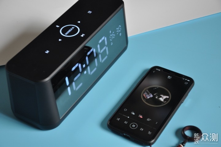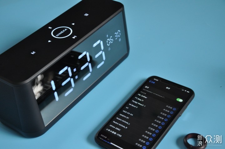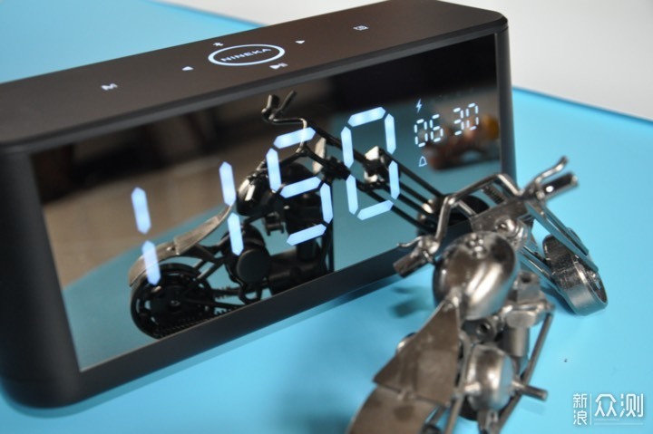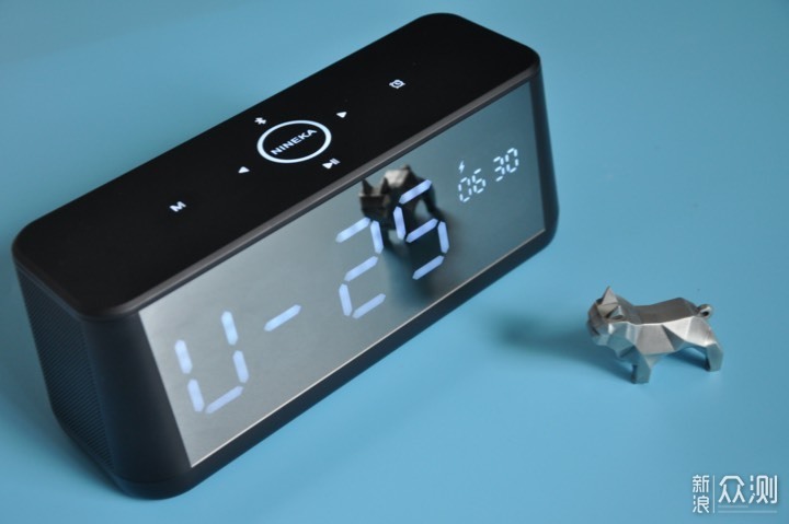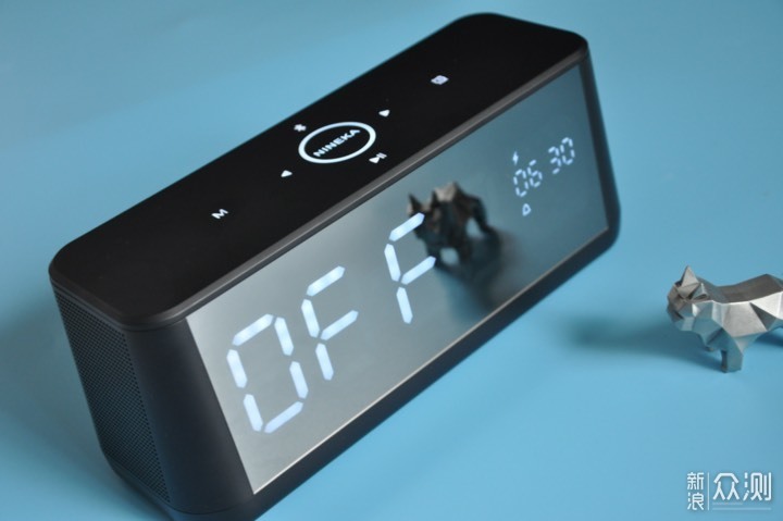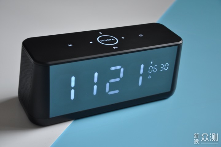 第一眼看到NINEKA南卡B1桌面时钟蓝牙音箱的时候,脑子里立刻浮现出两个词:简洁、大气。就像图中看到的那样,产品正面一整块镜面大屏,关机时就是一面镜子,开机后就是一块可显示时间、日历、电量等信息的大屏,在大屏中内置着106颗高亮LED。