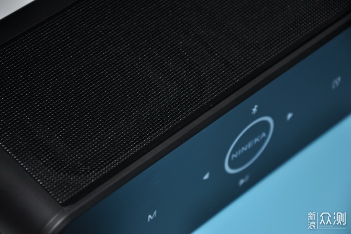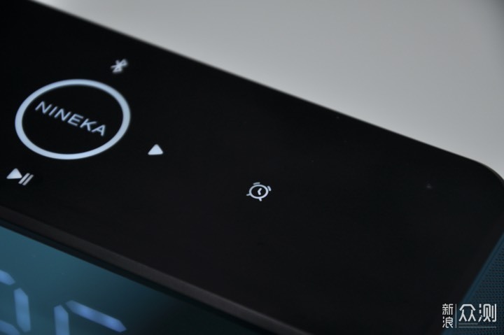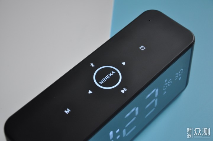 音箱顶部采用触摸控制面板,正中间“NINEKA”的LOGO被一个圆圈包围,在圆圈上进行顺/逆时针手势操作可进行音量增大/减小的调节。其他按键采用左右对称设计,分别是上一曲、下一曲、播放/暂停、蓝牙键、闹钟键和模式键。右上角还有一个支持双向通话的降噪麦克风。