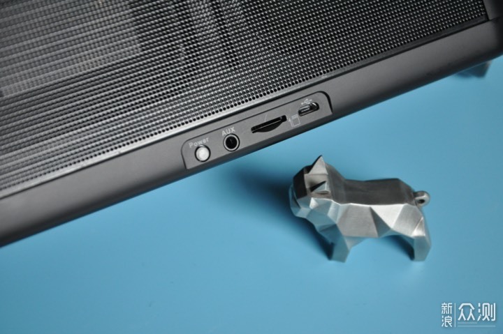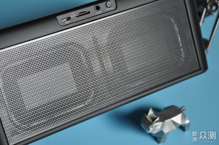 反观音箱的两侧及背面全部采用网状构造,在这网状结构的后面隐藏着2只55mm大尺寸全频扬声器单元(配合低频辐射器,还原饱满音质)和2只环形低频增强器高达30W的峰值功率(使得低音下潜澎湃,提供层层推进的浑厚低音)。而在网状结构的正下方则是四个音箱接口,由左到右分别为电源开关/四档亮度调节键、外接音频输入接口(内置复位键)、最大 支持32GB的Micro SD卡槽和电源充电/数据传输接口。