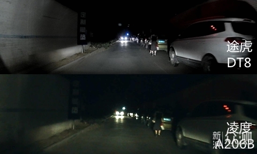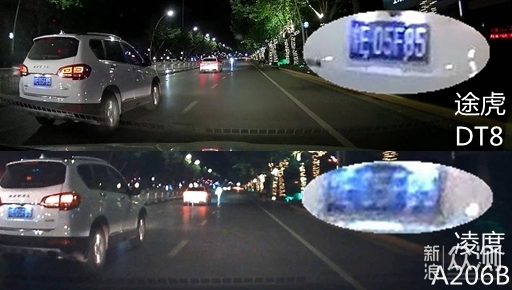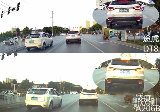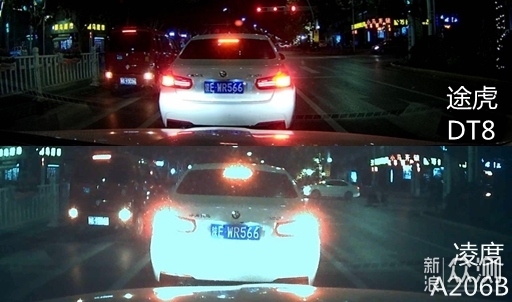 大家都知道夜间行车的事故风险更高,所以记录仪的夜间拍摄能力至关重要,而DT8号称高清夜视行车记录仪,那么表现如何呢?从图中可以看到DT8记录的画面无疑更清晰,而且画质细腻无明显噪点,凌度A206B记录的画面发虚,并且噪点明显,前车尾灯光晕明显已经无法看清尾灯轮廓。