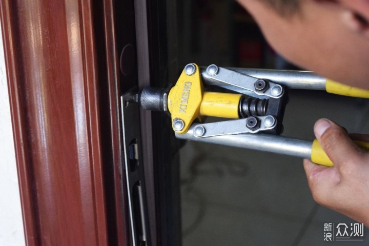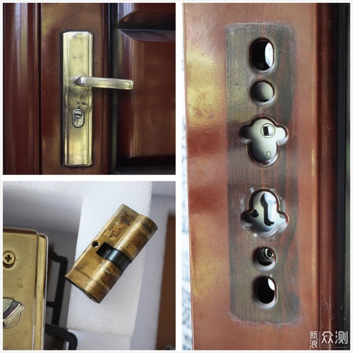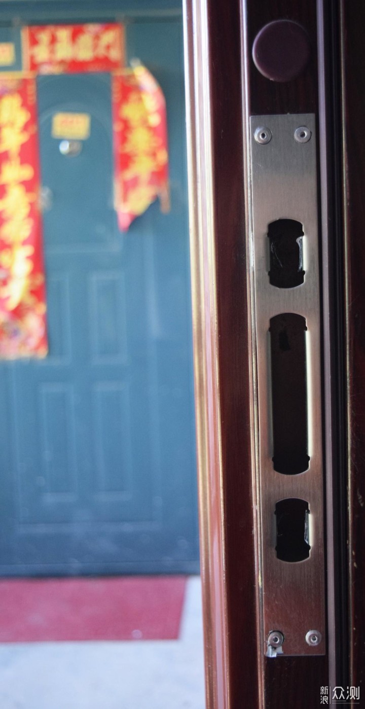这是实际的安装效果图,注意对应四个孔采用的是铆钉而不是常见的螺丝,好像是用来避免长时间使用后,螺丝松动导致门锁上不紧的问题。