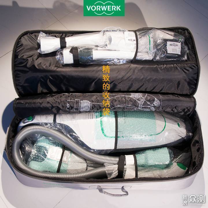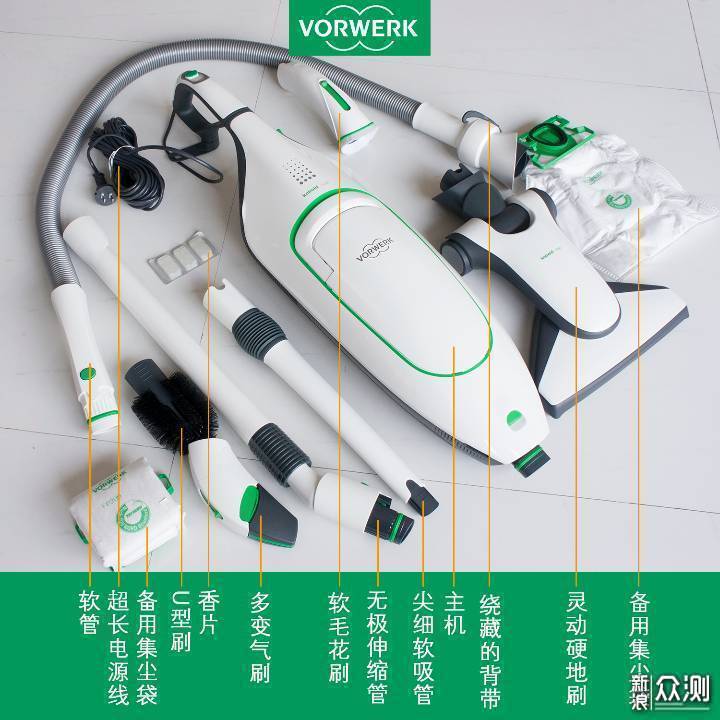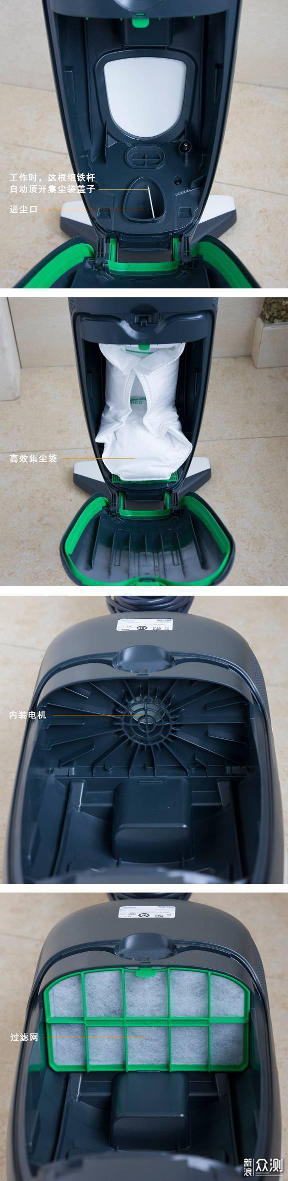 买过很多吸尘器,早年流行日本三洋,但没多久吸头坏了,不能修,只能换,一问,价格与整台吸尘器买价差不多。而且,三洋吸尘器二次污染很严重,一边吸,出风口排出的就是微小颗粒,那个年代还没PM2.5之说,现在回想起来,只能哼哼了……。 早就听说德国福维克吸尘器,我这次测试下来,有几大优势: 一是吸力强劲,它采用了直立式设计,地刷到滤尘袋、电机几乎是直通的,没有了普通吸尘器那样长长的、弯弯绕绕的吸尘管,减少了空气阻力,使吸力更强劲。 二是耗电省,它只有700W的额定功率,最大吸力280W,吸气45升/秒。 三是噪音低,经济档吸尘,噪音几乎可以忽略不计,强力吸尘时,噪音也才70分贝左右。 四是一次性滤尘袋的设计,这款滤尘袋采用了分层设计:内层比较大,主要阻止各类比较大的颗粒灰尘,并有抗异味珠,用于防臭;中层为超细纤维静电过滤布,用于阻断微小微粒尘埃;外层比较坚固,确保滤尘袋的牢固。这样的滤尘袋设计,杜绝了二次污染。开始我想,这个口袋做工那么精致,入口还有漂亮的卡扣配件,一次性就扔了多可惜?满了么倒出里面的灰尘,洗洗晒晒再利用多好?后一查店铺配件价格,6只装的滤尘袋180元,也就是说每只滤尘袋也就30元,每只滤尘袋能使用3——6个月,这样一算,一年下来也就60——120元左右,何必舍不得扔呢?毕竟旧的滤尘袋的透气性根本无法与新滤尘袋比,何况还会带来二次污染、失去防臭功能的风险。刚有人告诉我,她家的吸尘器,每次倒灰尘是个尴尬事,尘埃飞扬,她羡慕我的尘袋是一次性的。这里还值得一提的是背带设计,它是藏在软管端口的圆圈里,手一拉那根钩子就出来的,旋转白色短圆管旋转就绕回去了,操作方便。手柄可4个节点伸缩,伸缩的手柄制作工艺不错。 不过缺点也有,我的体会是这种有线吸尘器,因为拖着一根尾巴,操作起来真不太方便。