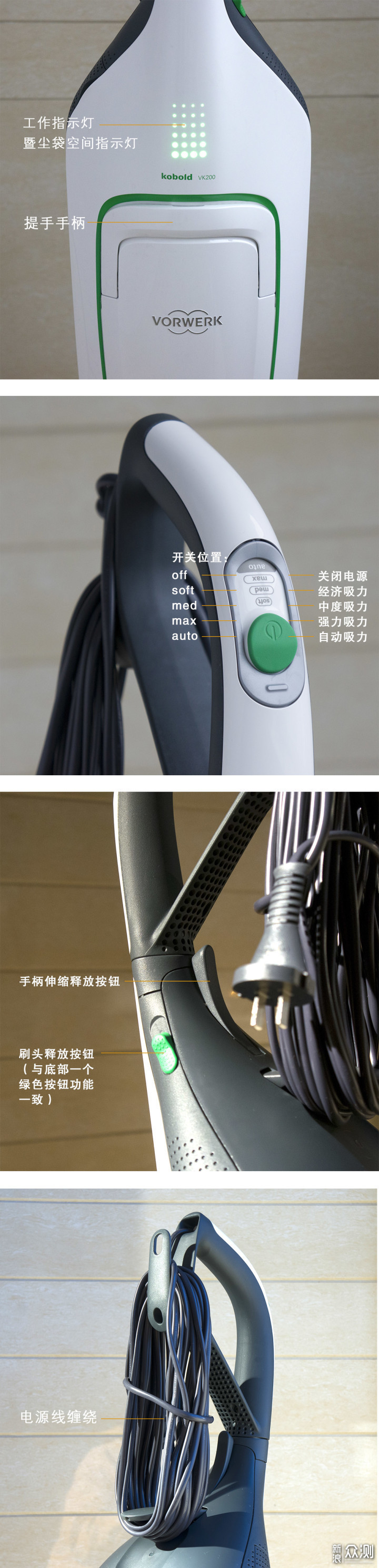 插上电源,推一格以后指示灯亮起,指示灯除了表示工作中,还有一个用处是观察滤尘袋的充盈状态,指示灯全亮,表示滤尘袋空,随着指示灯的减少,滤尘袋慢慢满起来,指示灯变为橙色时,就要更换滤尘袋了。开关推一格是soft,即经济吸力;推2格是med,即中等吸力;推3格是max,即强力吸;再推一格是auto,即自动吸力状态。还有就是手柄可以伸缩,手柄后面有个释放按钮,还有更换吸头的副按钮。这台机器无自动收缩的电源线,有点遗憾,也许是自动收缩容易坏,难维修,德国这样的名企,不会不考虑这个问题。其实缠绕外面,好处也有,方便擦拭。我量了一下电源线的长度,从把手到插头的长度为:9.7m,一般的客厅、房间足够用了。