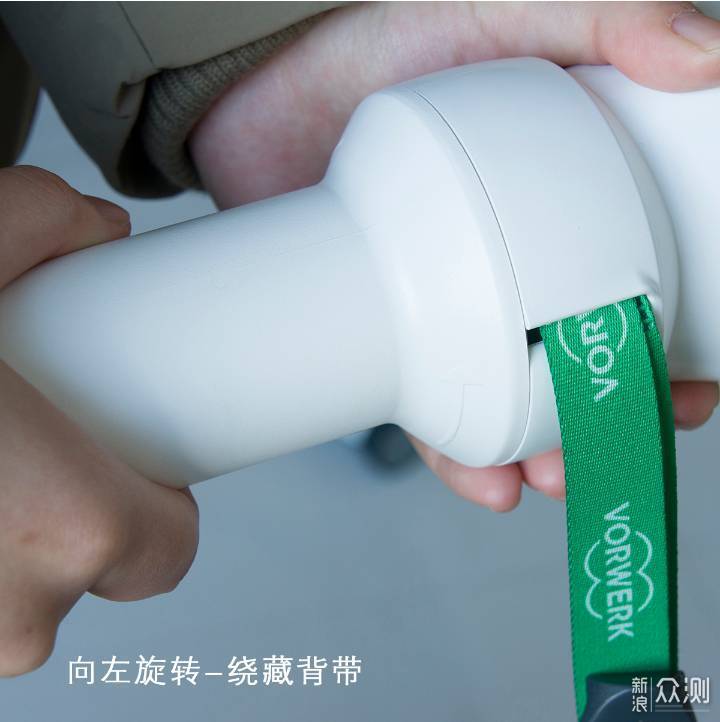 背带不用时,藏绕在软管的一端,用好后,用手向左旋转,背带藏绕回软管内。这个设计不错,手动应该不易损坏。