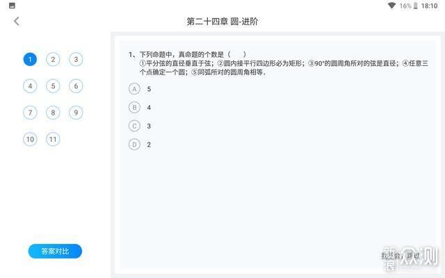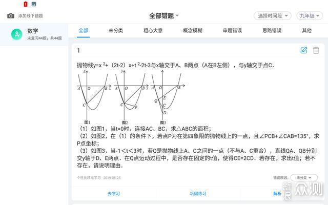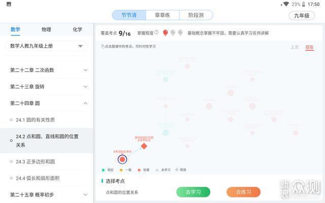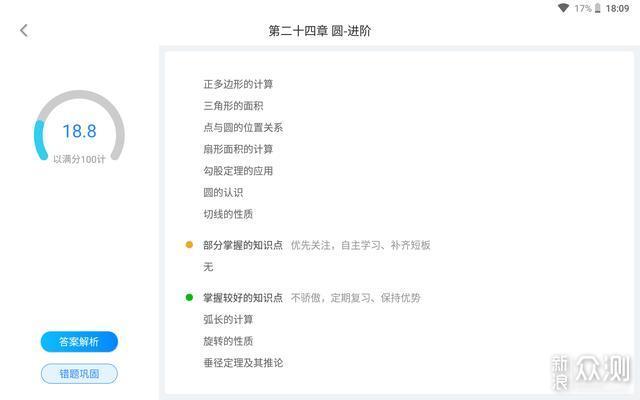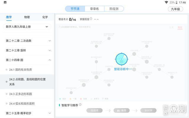 我们以人教版九年级数学上册中的《圆》章节为例,首先我们可以在右侧的考点图谱中清晰地了解到本章节中涉及到的考点内容。下方的“找弱项”为第一步,点击后出现10道测试题来考核孩子课堂学习的掌握程度,答完题后提交即可了解错误内容,每道题下方有详细的解析和难度等级划分,同时将题目考察的知识点清晰的列出。