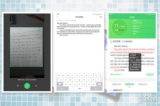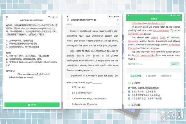 跟读模式下孩子一边听语音播报,一边学习句子,当播完一句话后,需要进行复述,系统会自动录音并回放,接着对朗读效果进行评分。评分结果以不同颜色标注在语句上。 5、写作文 作文模块中可以根据课本中给出的作文在纸上进行书写,写完后使用拍照功能拍下作文,系统会进行自动识别并评定,综合后给出成绩和评价。智能批改后进行完整性、准确性、流畅性分析,对整篇作文进行了深入的剖析和点评。
