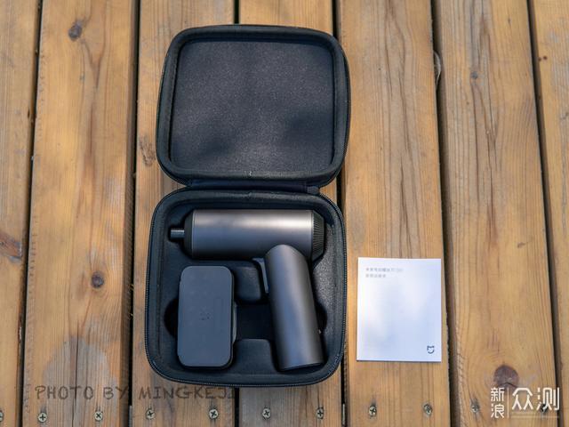 拆掉包装呢,可以看到黑色的收纳盒,收纳盒中放置了电动螺丝刀主体和批头盒、充电线。收纳盒的设计是我非常喜欢的一种设计,用在电动螺丝刀上,可以十分便于产品的携带和存放,收纳包内还设计了高密度的硬质海绵,可以有效的保护内部的产品。