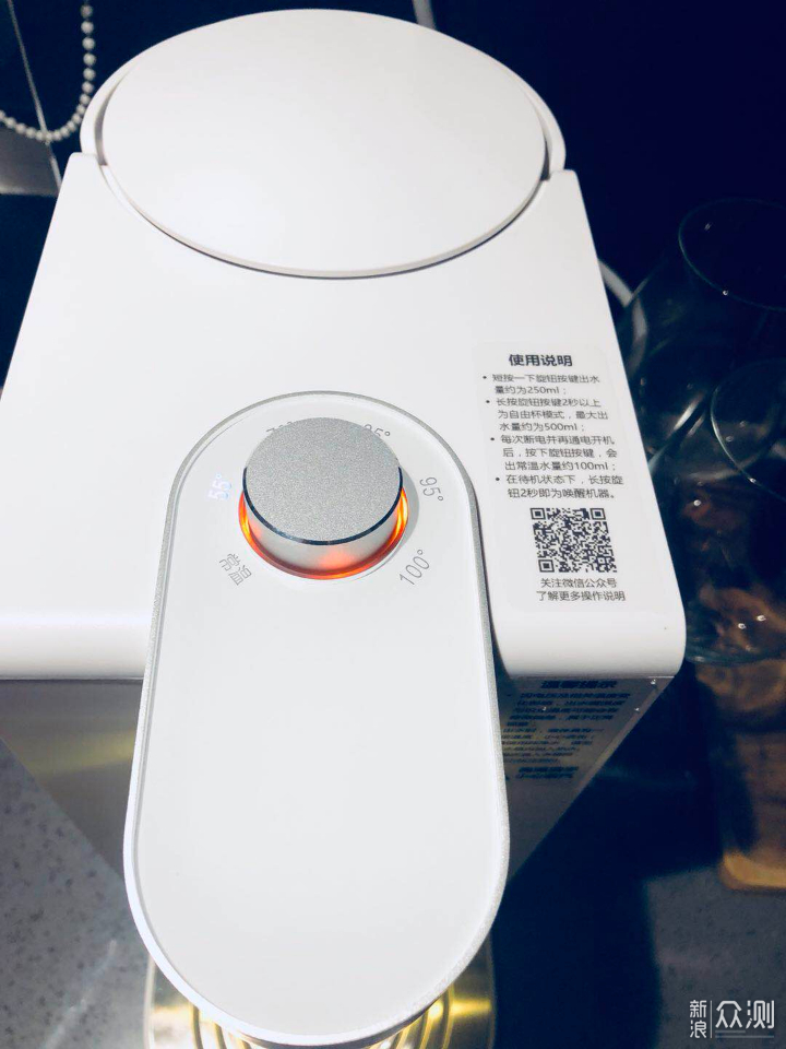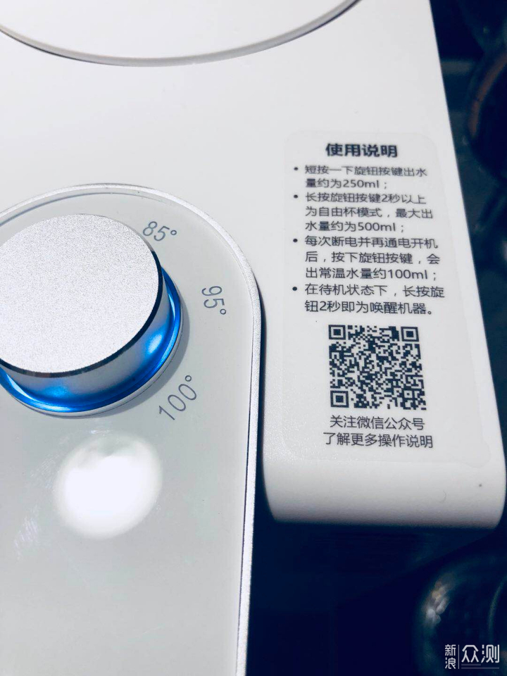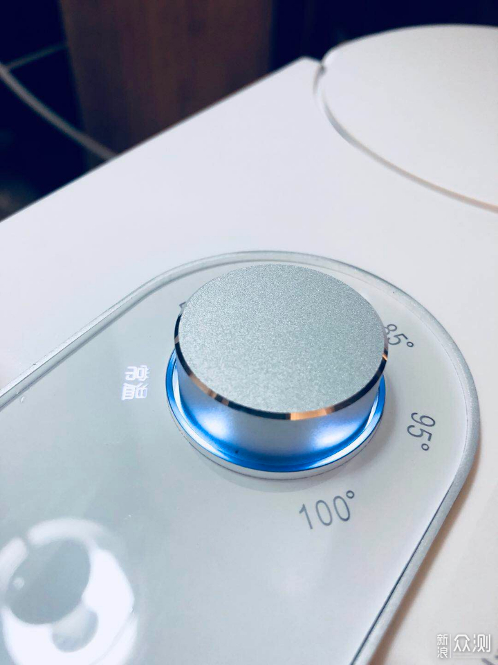 开机后,旋钮会有蓝色背光显示,所选档位也会有白色LED灯提示(共设六段温度:常温、55℃、70℃、85℃、95℃、100℃)。此外还有一个除垢模式指示灯(橙色),使用一段时间后会自动亮起,平时为隐藏状态。旋钮的喷砂工艺处理不错,手感一流,但是旋转和按压的阻尼感一般,感觉不够紧凑略松散,降低了品质感。