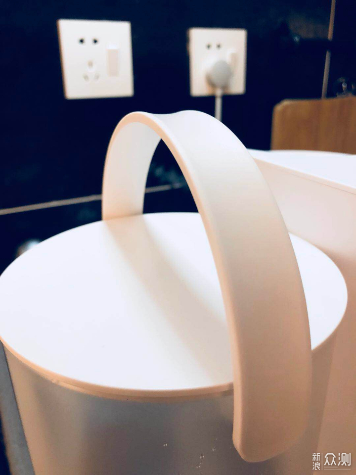 这个小浮标我研究了半天,具体的原理没搞清楚(可能是磁控?),功能应该是用来监测水位的,当水位低于预警线,主机就会缺水报警,提示加水。 放一个储水桶拎手的特写,弧度设计的握感很舒服啊!