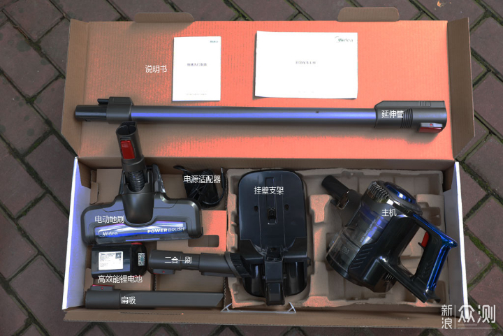 配件主要有: 打开包装后,可以看到配件相当丰富,包括电动地刷、延伸管、主机、电动地刷、二合一刷、扁吸、挂壁支架、电源适配器、锂电池。