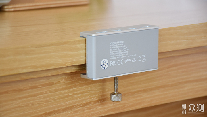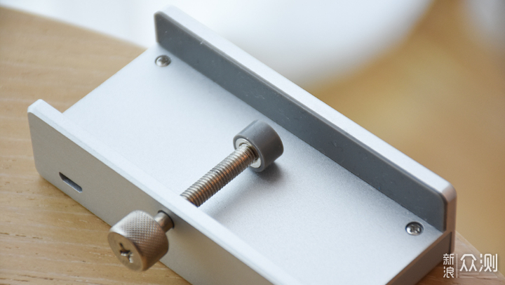 集线器内侧设计为一个凹槽,并搭配有一个可调节螺丝,正常使用的时候可以夹在桌面侧边或是显示器底部。在螺丝和卡口内侧与桌面接触的位置设计有橡胶垫,可以起到缓冲的作用,增加安装稳定性的同时也能有效防止损坏。