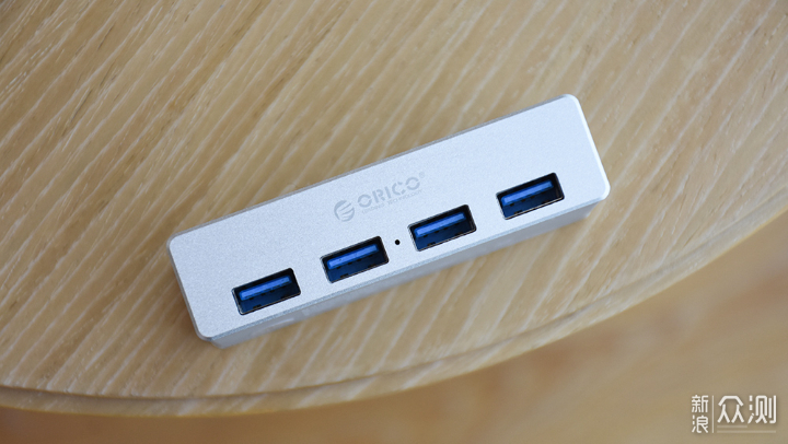 集线器上方设计有四个USB接口,均为支持USB 3.0的蓝色接口,两个接口中间有一枚指示灯。另外一侧印有ORICO的品牌标识。