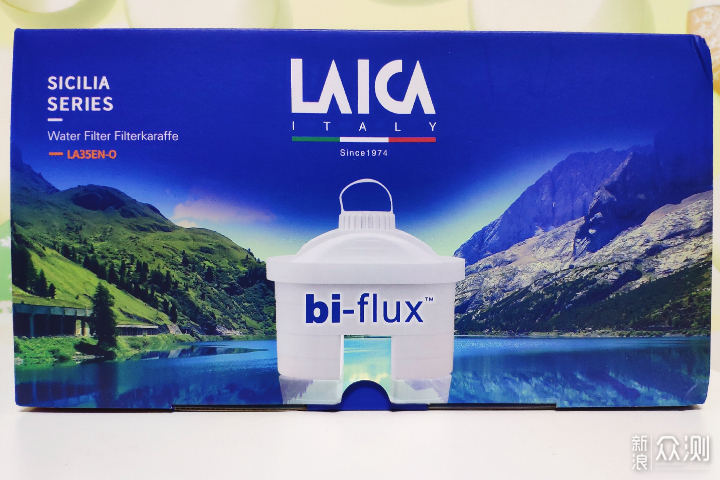 莱卡净水壶LA35EN-O包装的上表面是滤芯的实物图,并配有青山绿水作为背景,更增强了我们对健康水的向往。