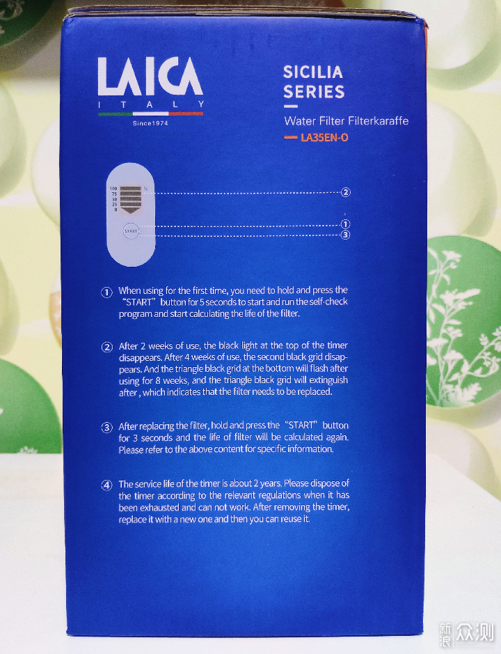 莱卡净水壶LA35EN-O包装的另一个侧面是对计时器的使用说明,使用说明采用了英文的标注,如果对英文理解起来有点困难的话,计时器使用说明的中文版可以在使用说明手册中阅读,建议初次使用者进行仔细的阅读,了解滤芯的使用和更换。