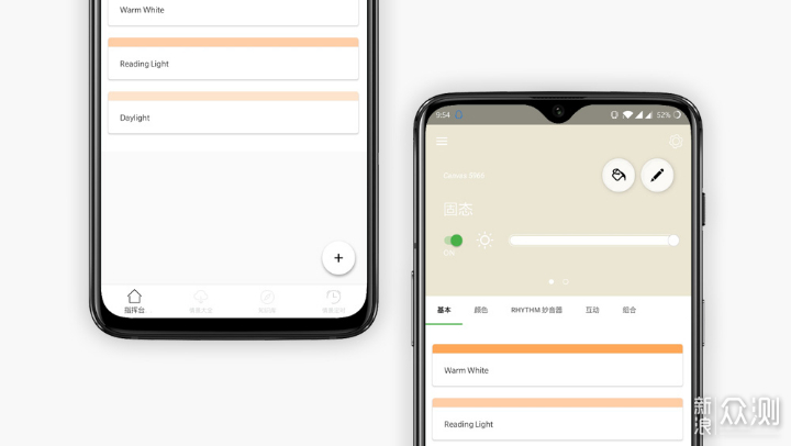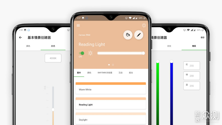 基本功能主要提供了默认的灯光模式选择,App内置有三种不同色温的亮度。通过情景创建器可以看到,灯光亮度支持1200K暖色温到6500K冷色温之间的调节。除了默认的三种灯光颜色之外,也可以通过创建新的基本情景来自定义灯光颜色,支持以RGB色彩或色号来自定义颜色。