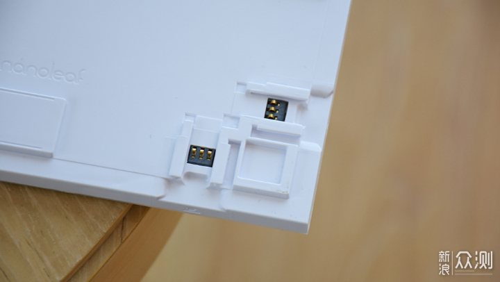 Nanoleaf智能方块灯的核心就是这九块灯板,不过其中八块是普通的发光灯片,单独一片作为控制灯板,通过联动方式来控制全部的灯光效果。灯板本身采用的是ABS材质,呈正方形,边长为15cm左右。在不点亮的情况下为白色,正面中间可以看到明显的十字,个人猜测应该是为了增强结构,对白色的灯板面板起到支撑作用。