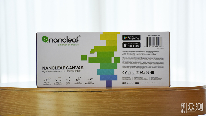 盒子的背面印有这款智能灯的七项功能特性,相较于正面简单的介绍会更加全面,让消费者在开箱之前就能够对产品有一个比较详细的了解。右侧的四张图片是Nanoleaf智能方块灯的使用场景,不过这么炫酷的效果是需要多个灯板拼接的。