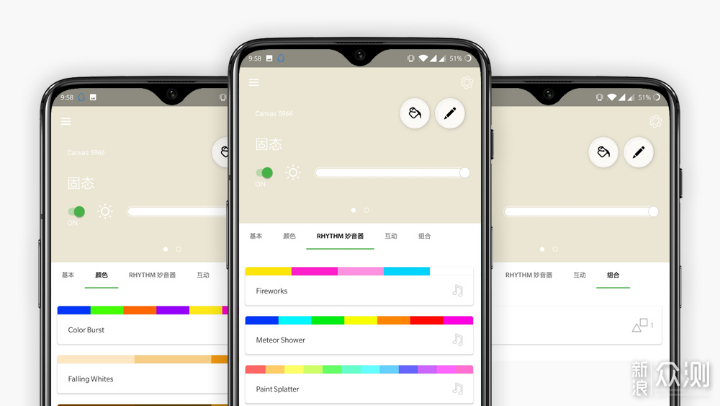 Nanoleaf App的功能并不算复杂,可以分为指挥台、情景大全、知识库以和情景定时四大模块,而日常管理功能则主要集中在指挥台模块中。指挥台模块又分为基本、颜色、妙音器、互动和组合五个选项卡,上方的选项背景根据灯光的实际显示颜色做出改变。