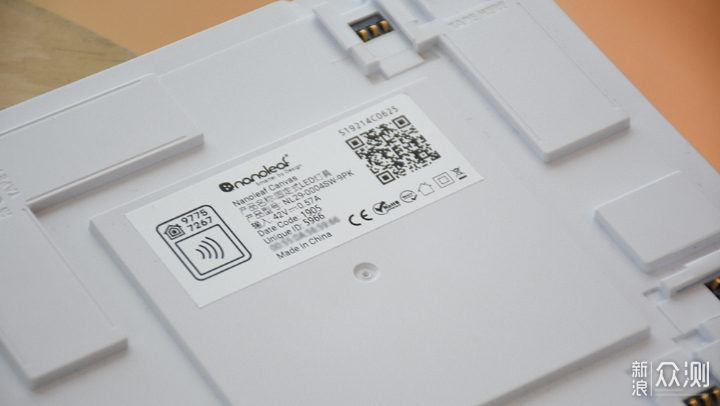 控制板背后中间的区域凸起,应该是内部设计有复杂的电路结构,从而占用空间。凸起部分贴有一张铭牌,记录着Nanoleaf智能方块灯的技术参数以及相关编码等。